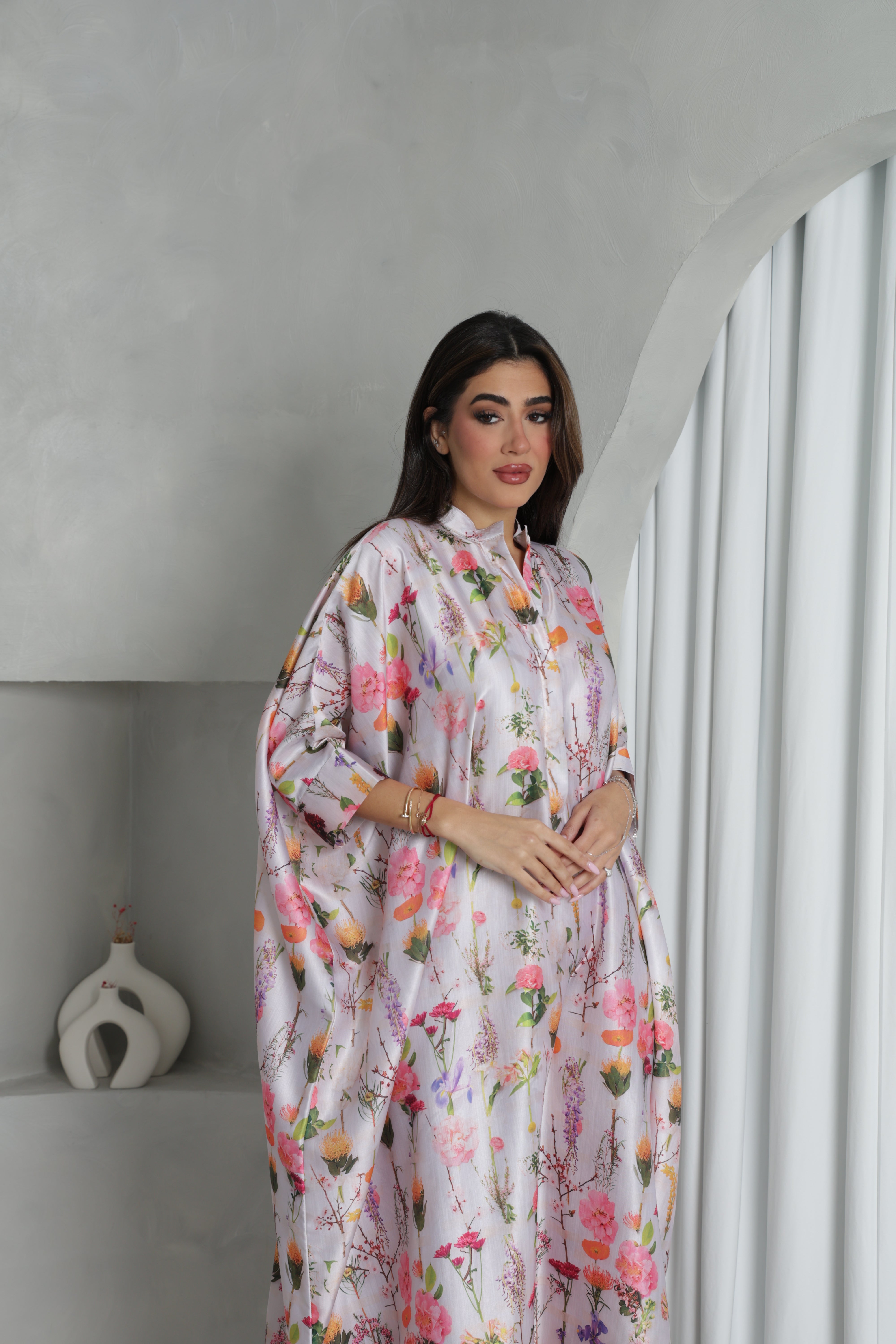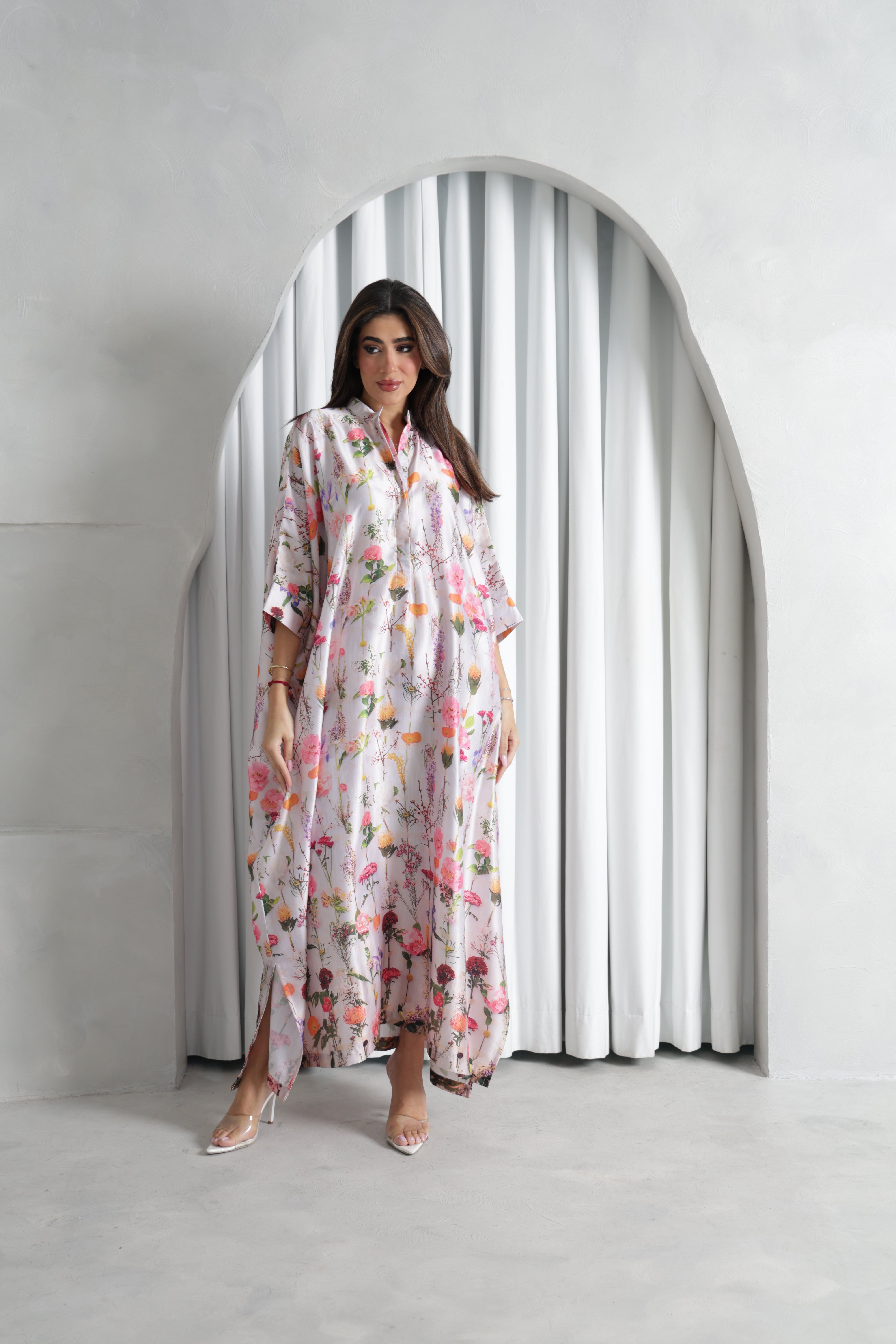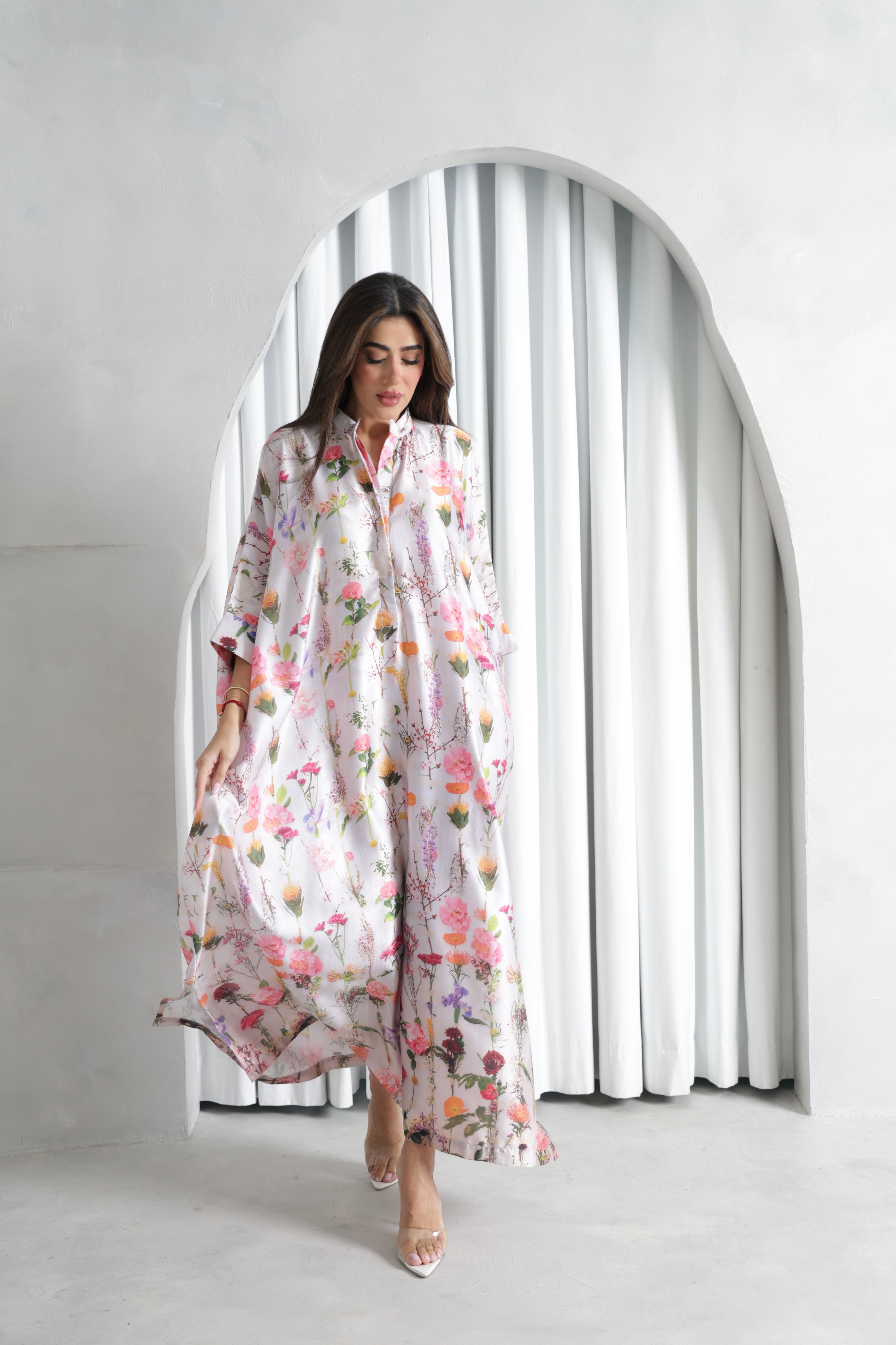 The Floral Serenity Dress is made from premium silk-linen fabric, featuring a soft pastel base adorned with delicate, colourful floral prints. Its flowing silhouette offers a blend of elegance and comfort, ideal for graceful daytime occasions.