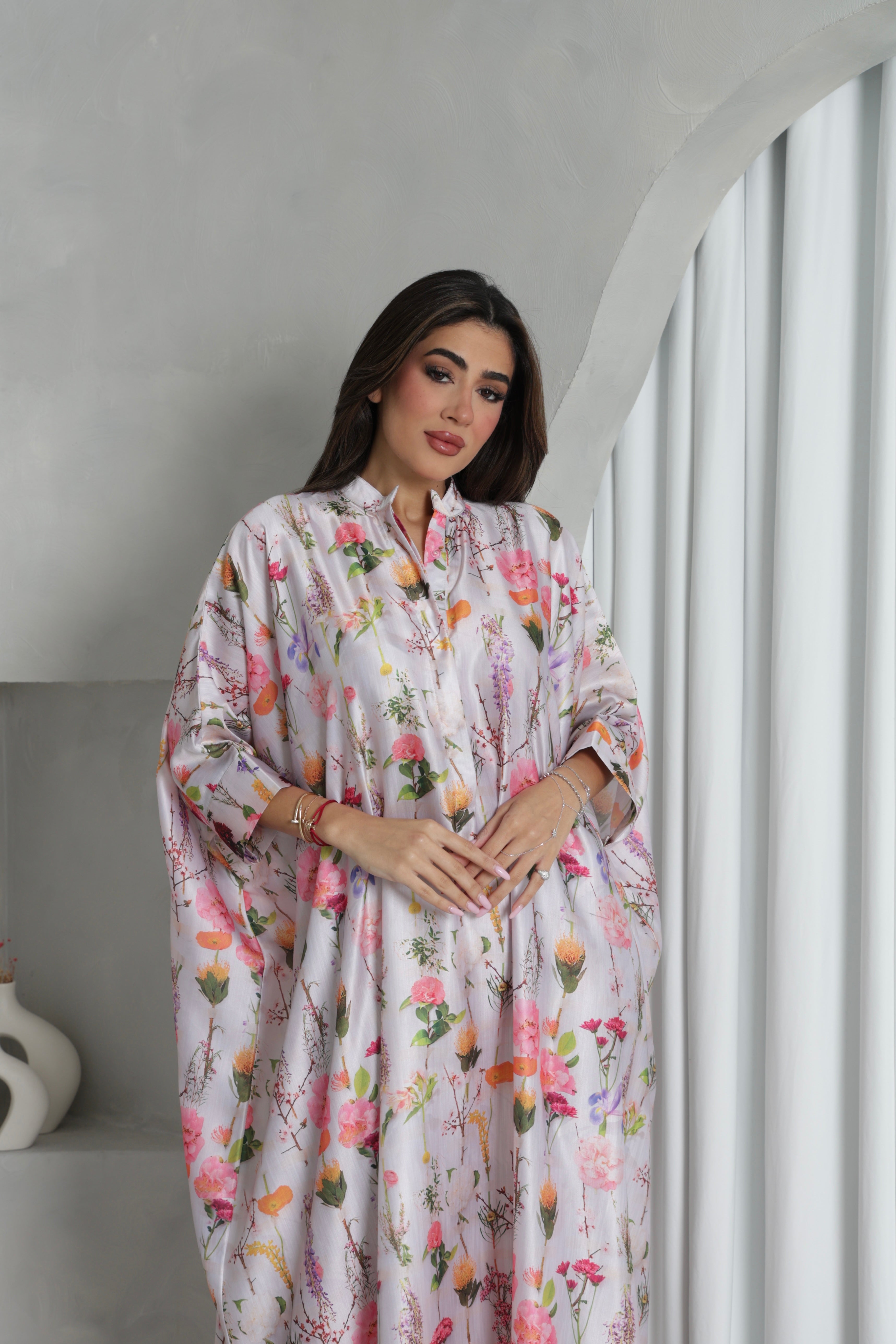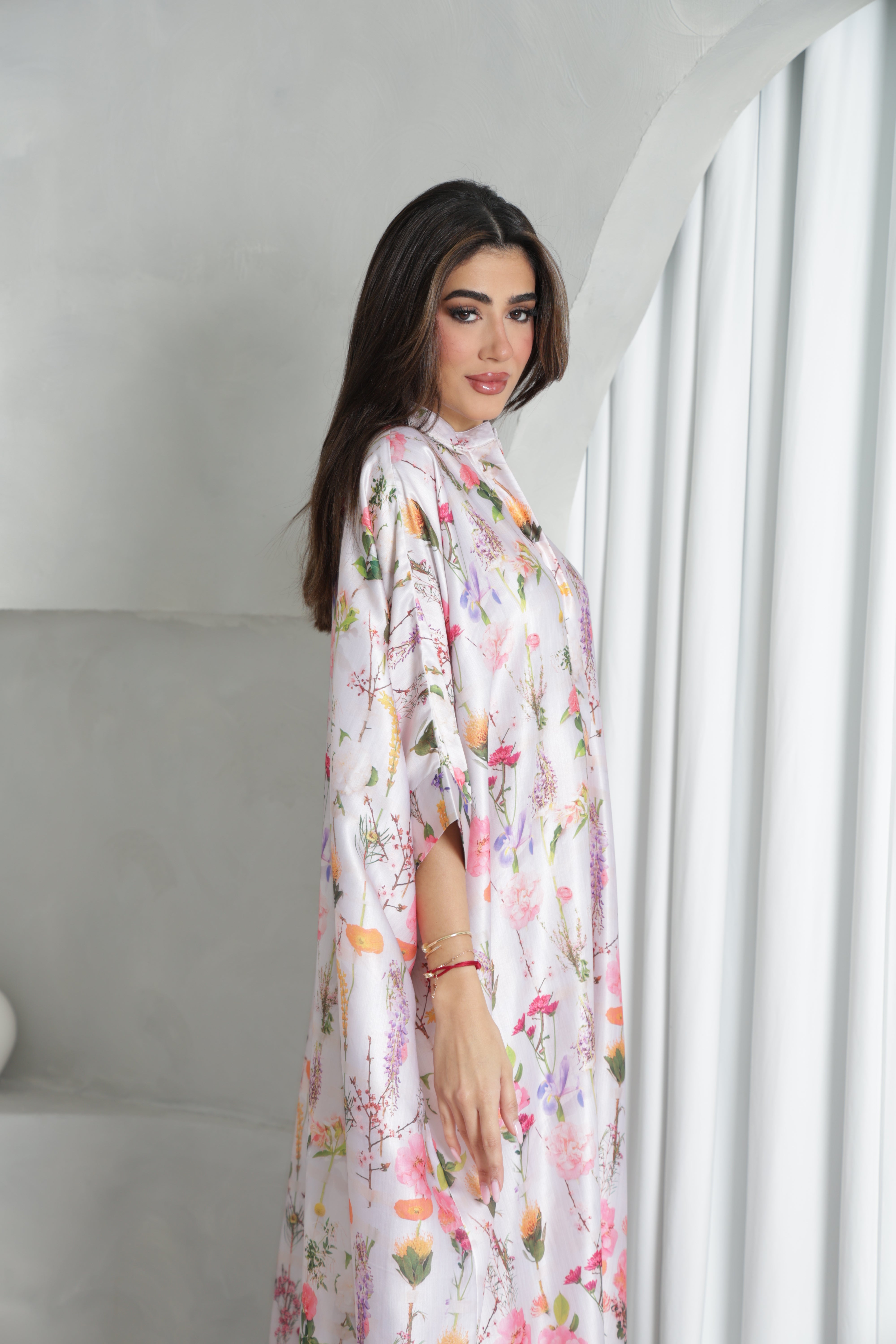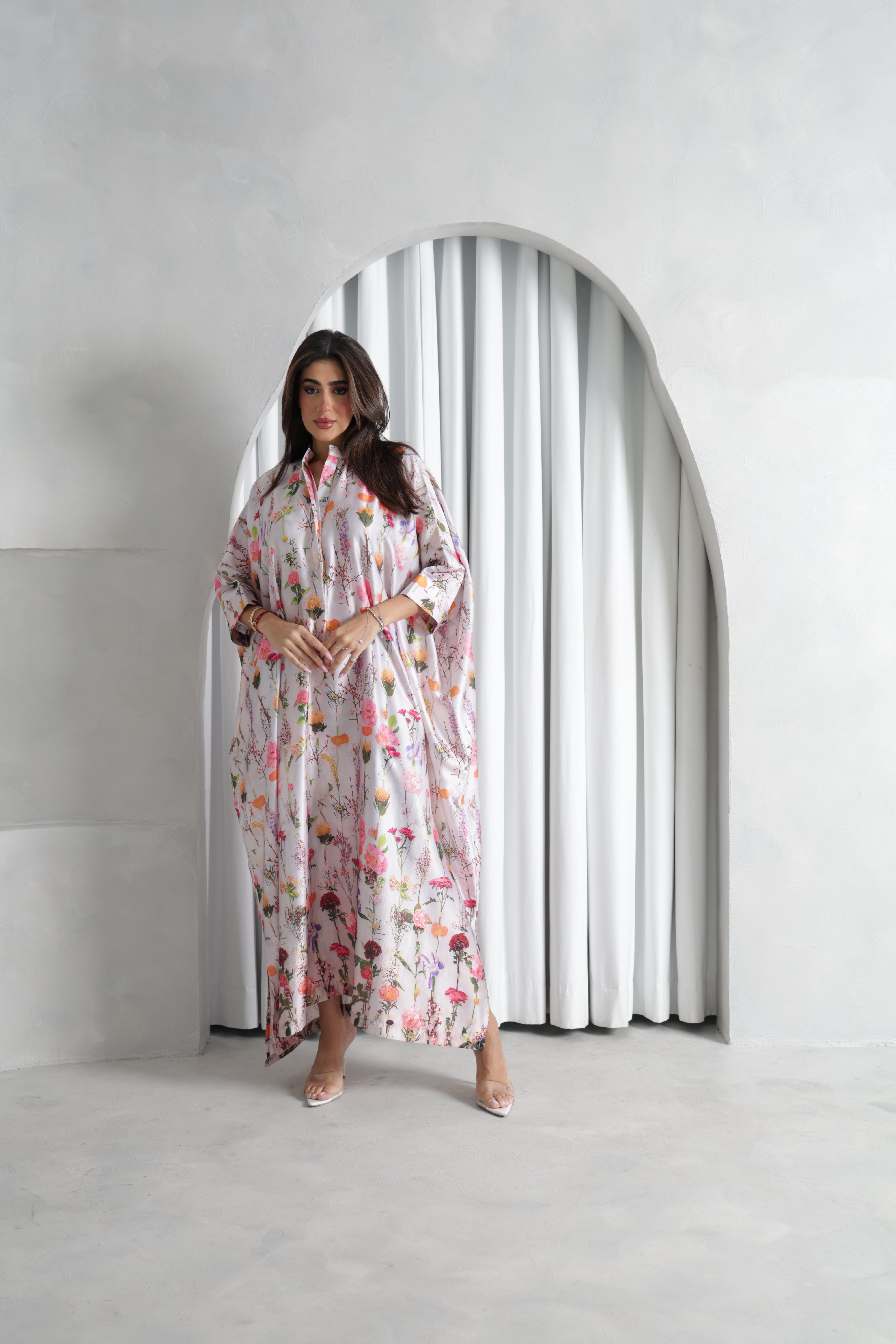 The Floral Serenity Dress is made from premium silk-linen fabric, featuring a soft pastel base adorned with delicate, colourful floral prints. Its flowing silhouette offers a blend of elegance and comfort, ideal for graceful daytime occasions.