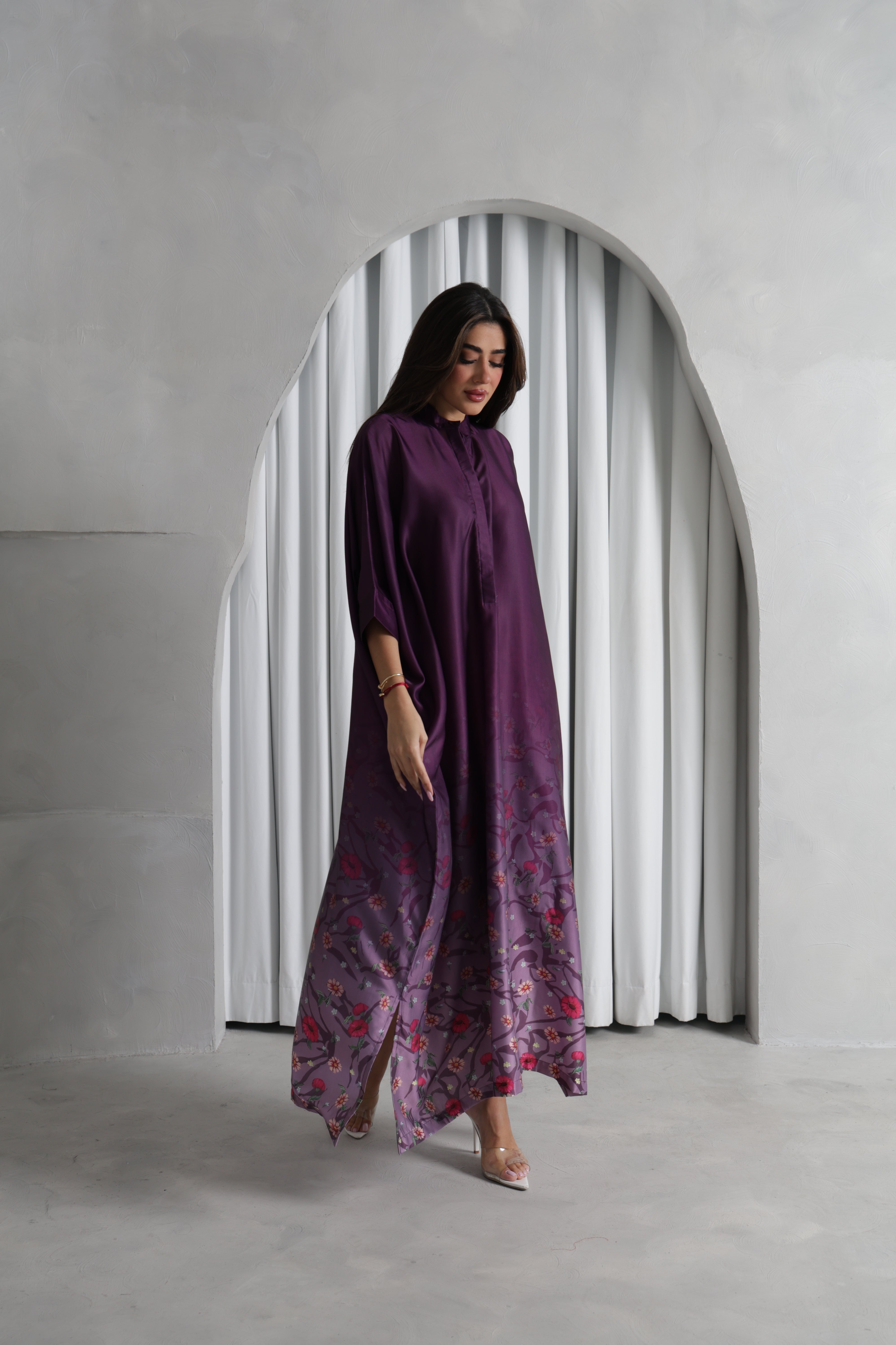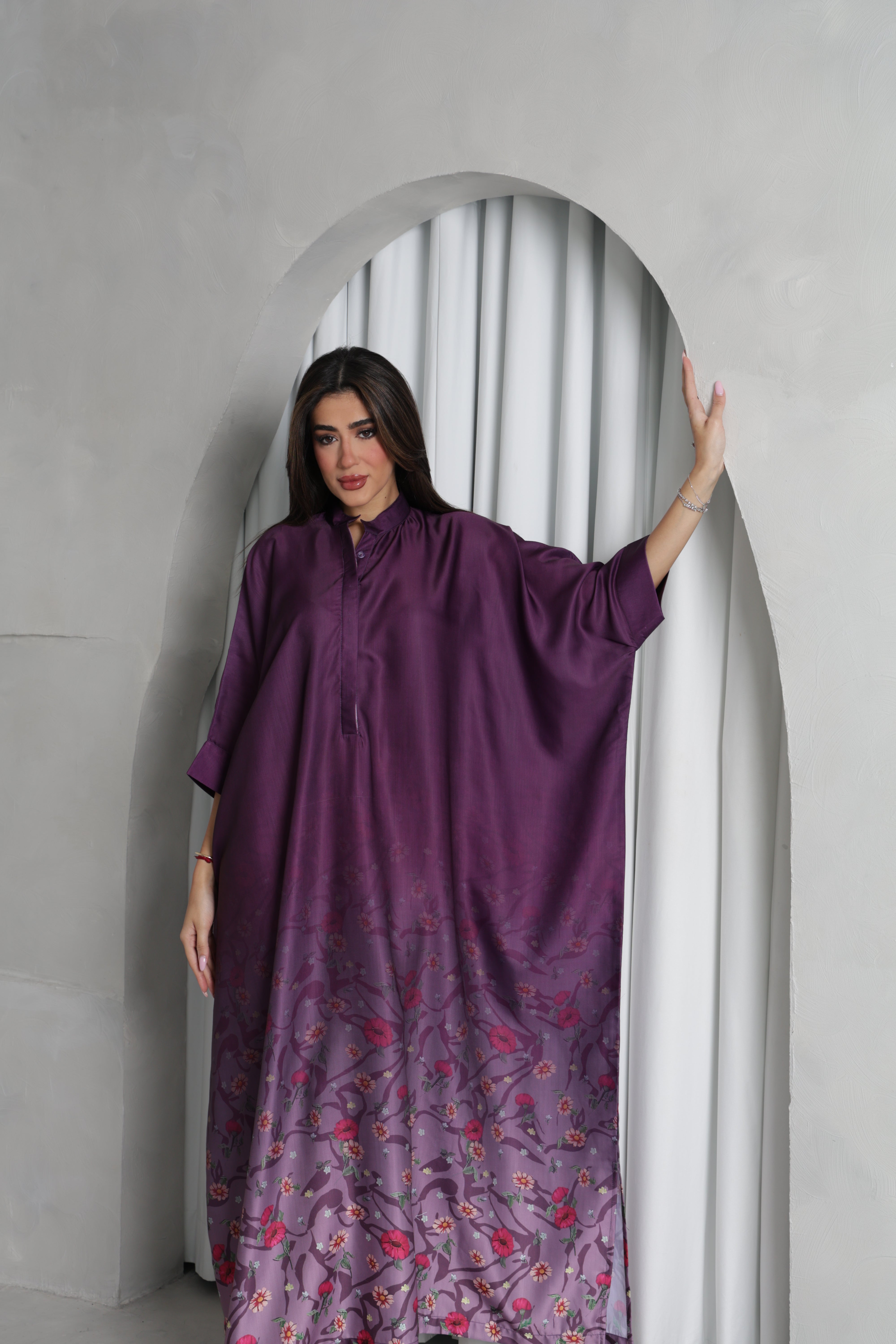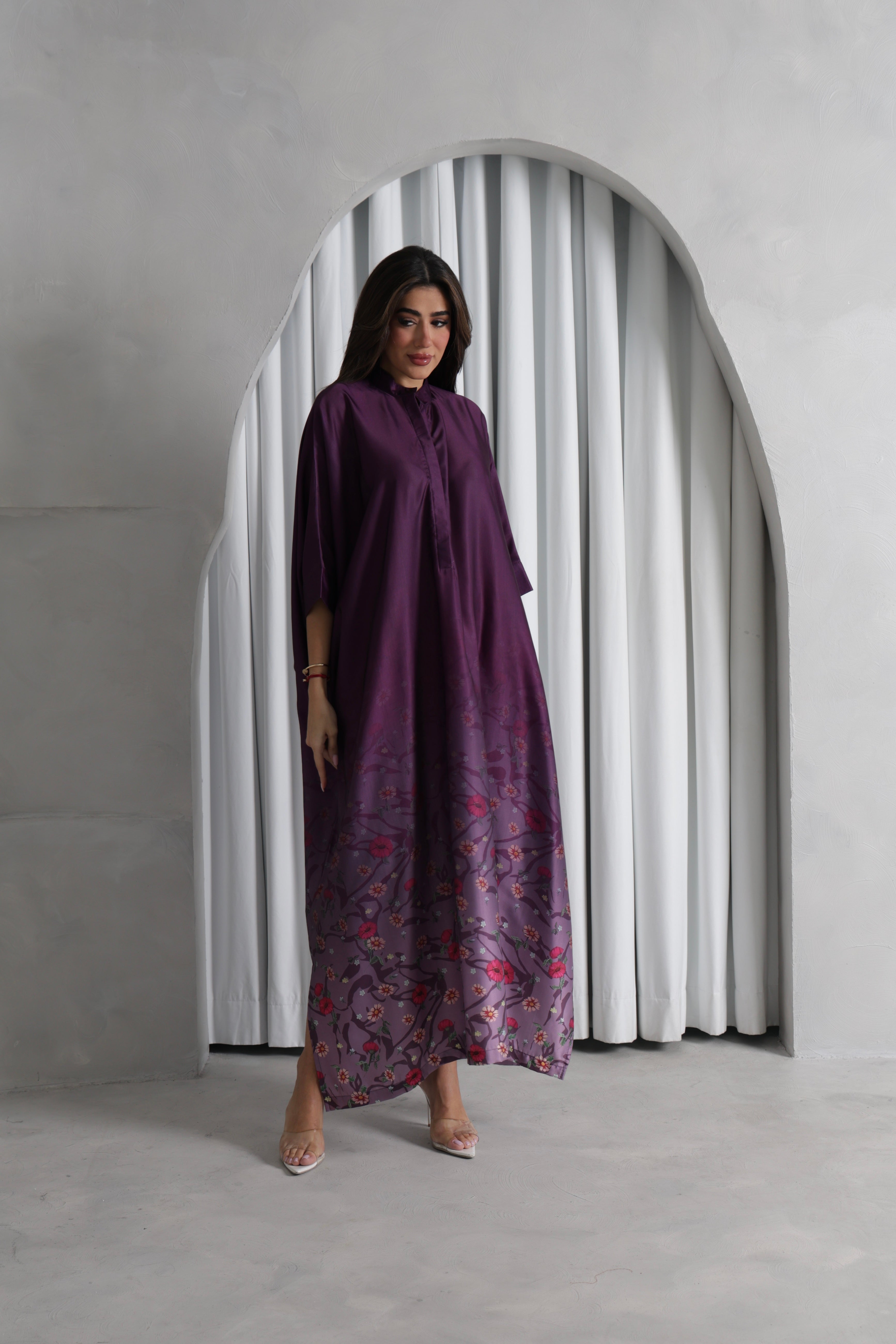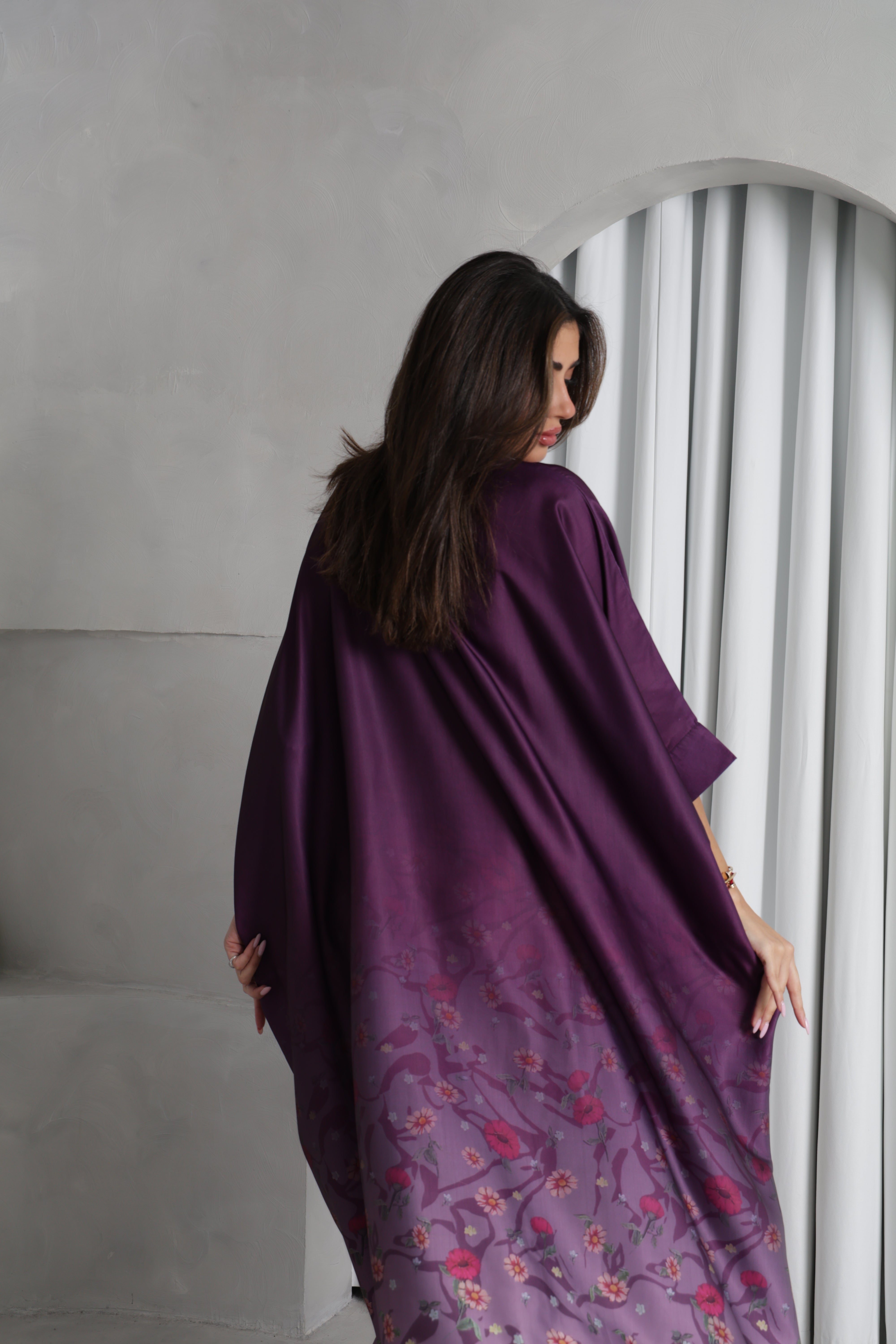 The Lilac Dream Dress is made from premium silk-linen fabric in a stunning lilac hue, featuring delicate floral patterns along the hem. Its flowing design exudes grace and elegance, perfect for special occasions and refined gatherings.