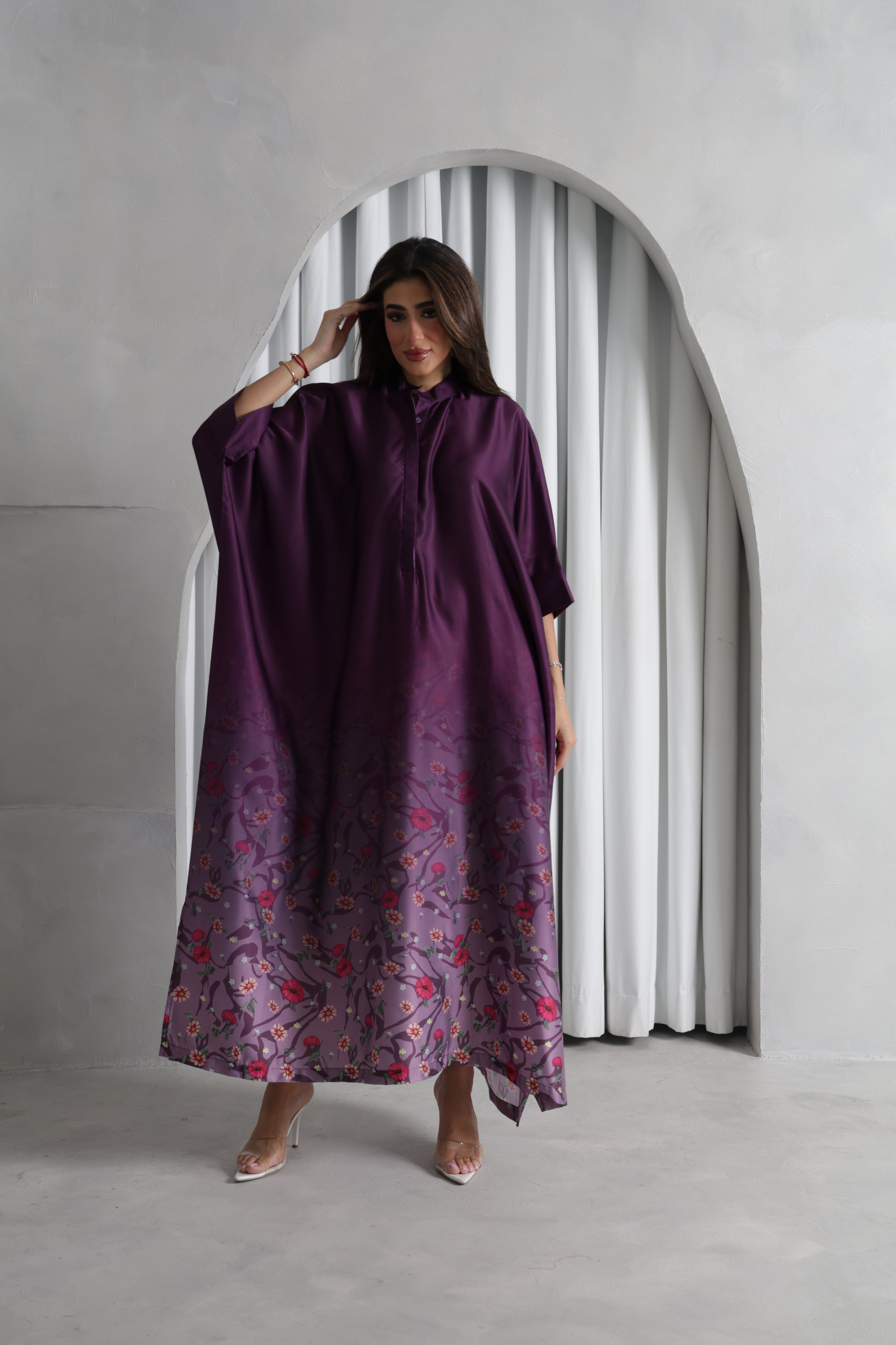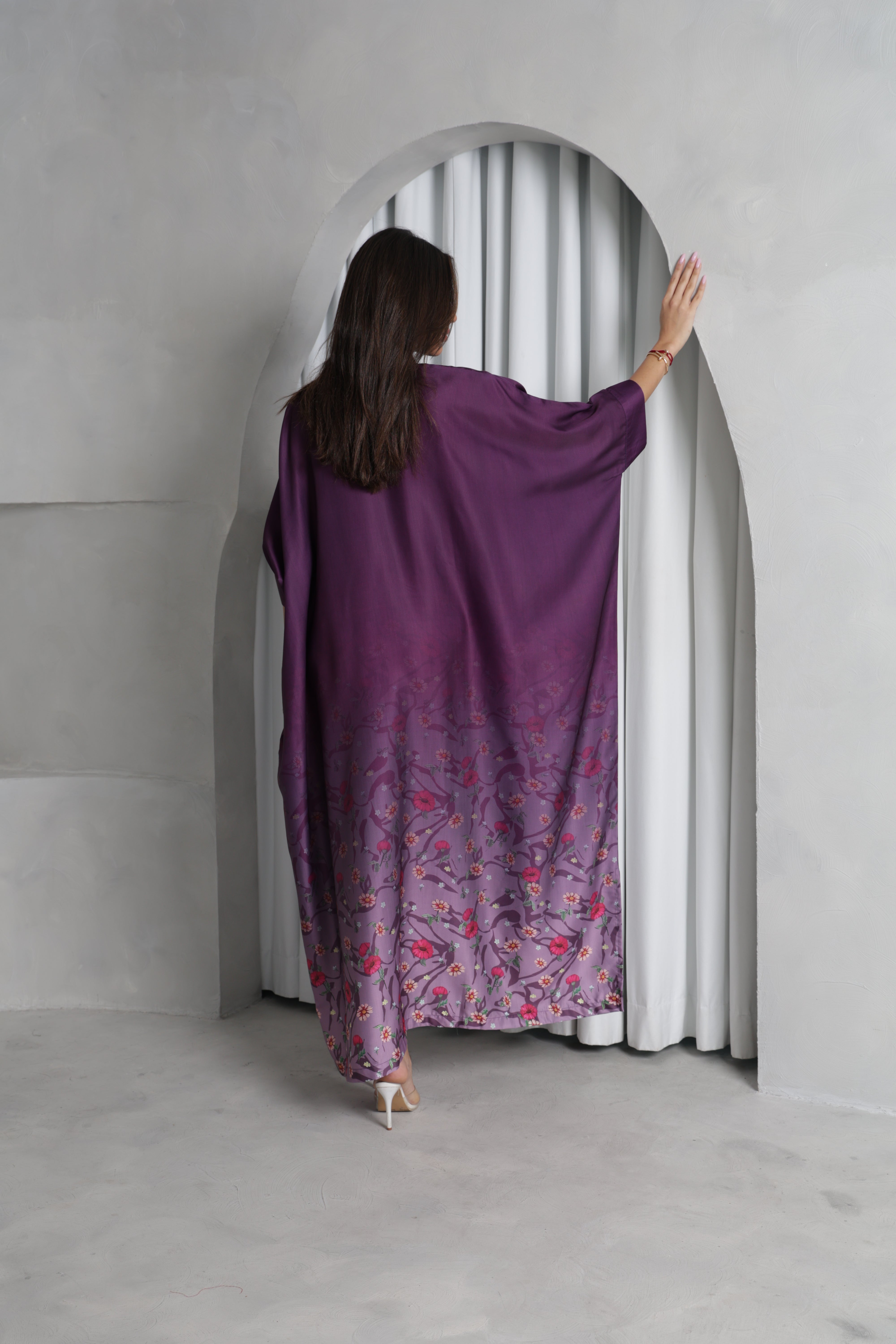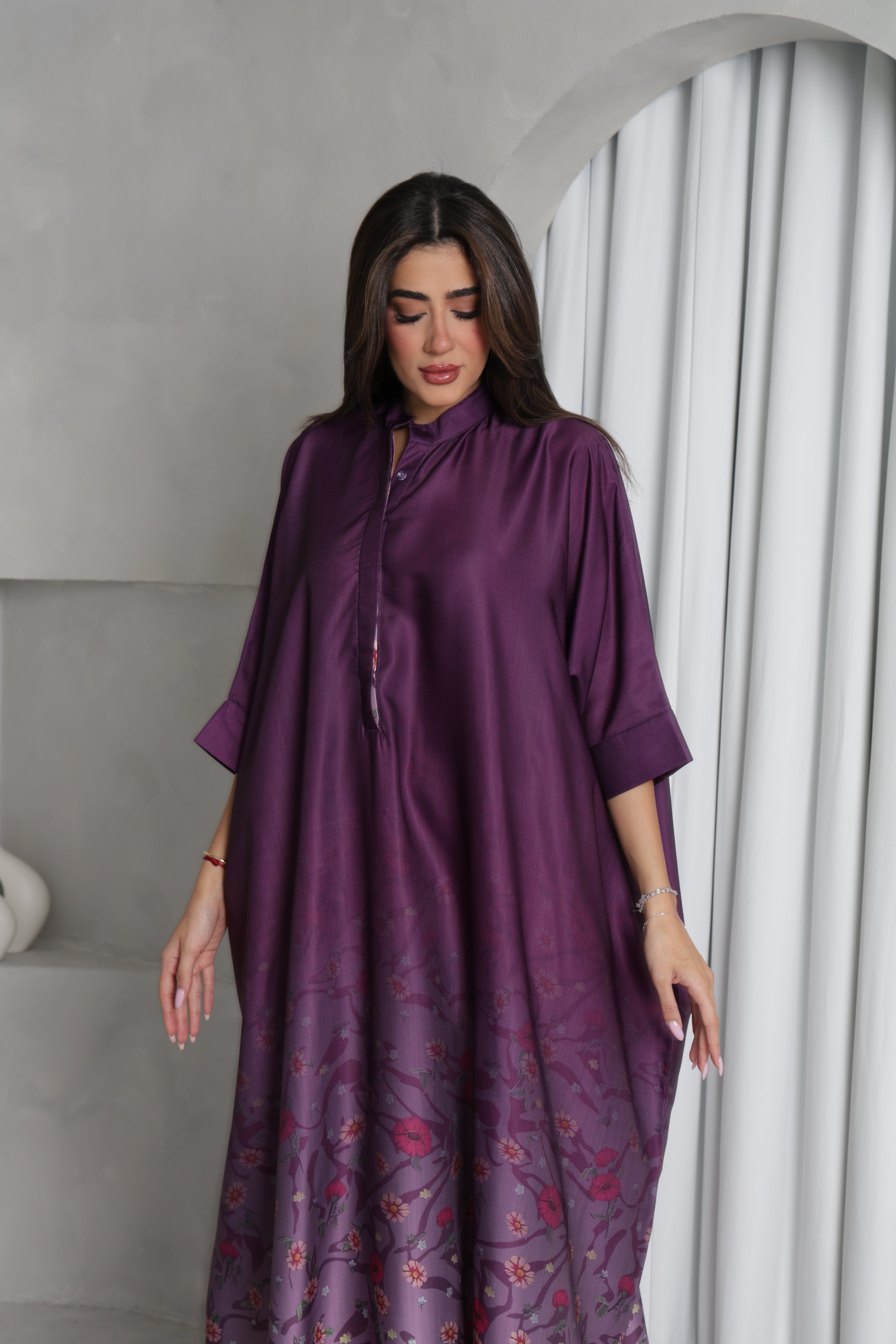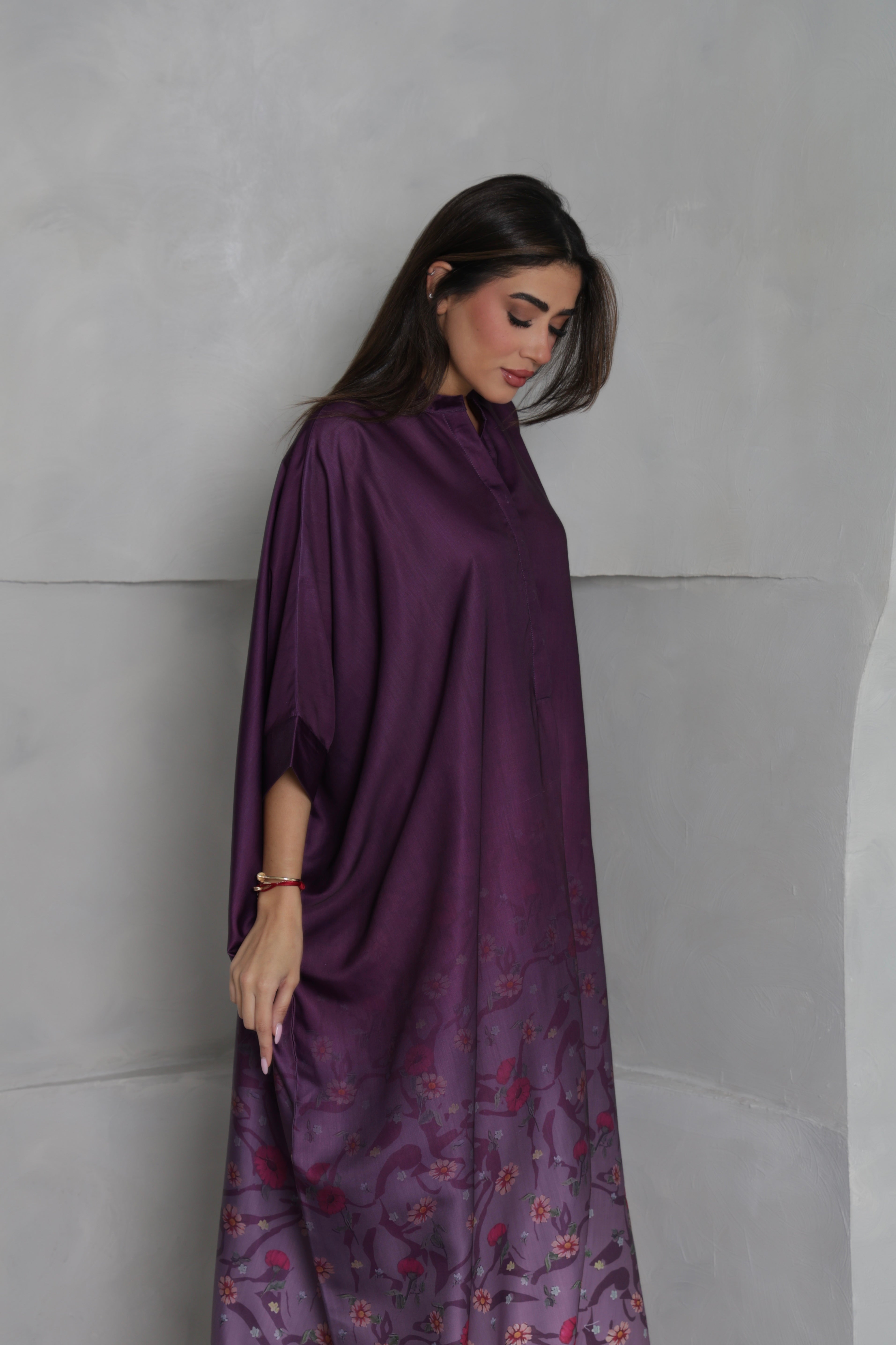 The Lilac Dream Dress is made from premium silk-linen fabric in a stunning lilac hue, featuring delicate floral patterns along the hem. Its flowing design exudes grace and elegance, perfect for special occasions and refined gatherings.