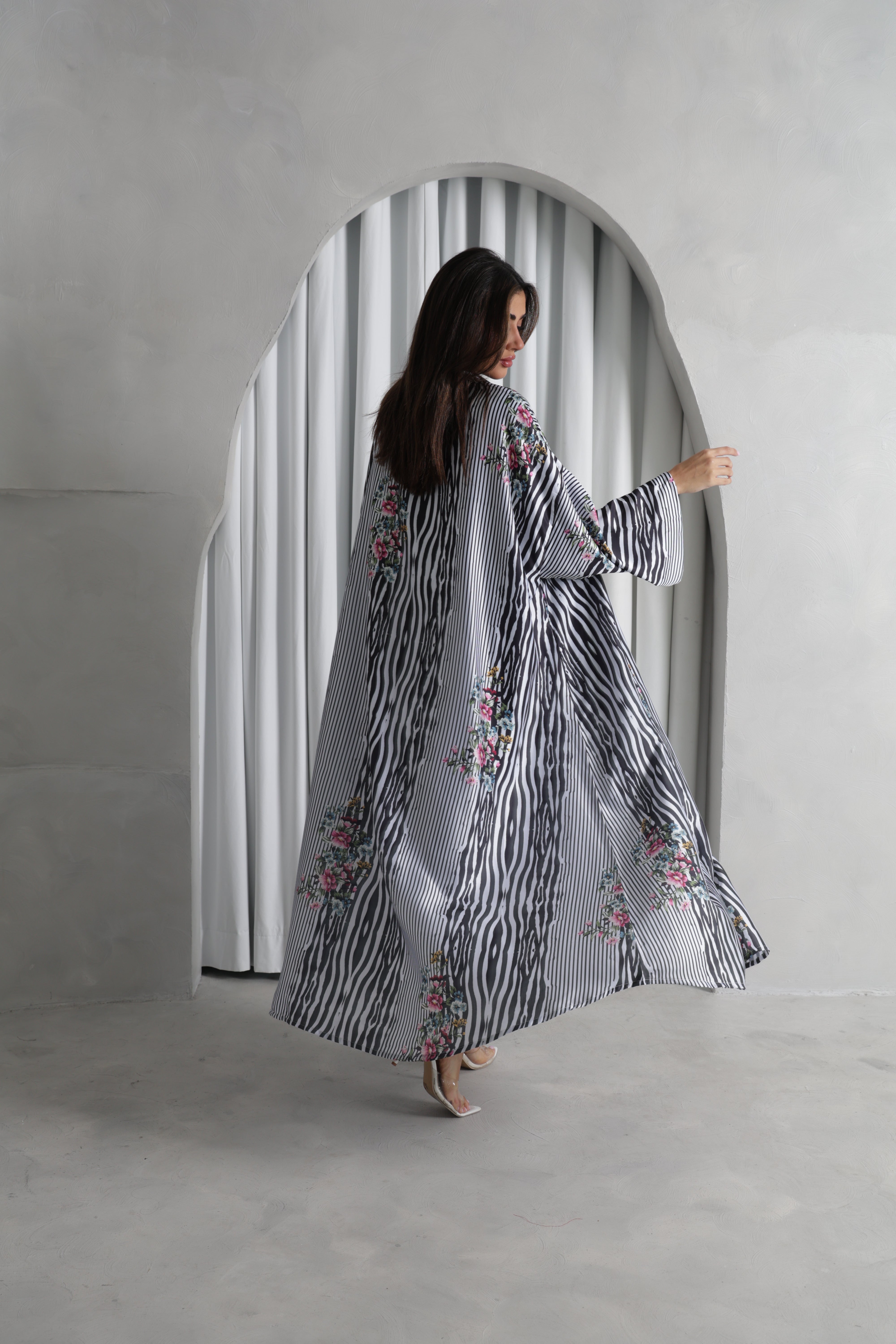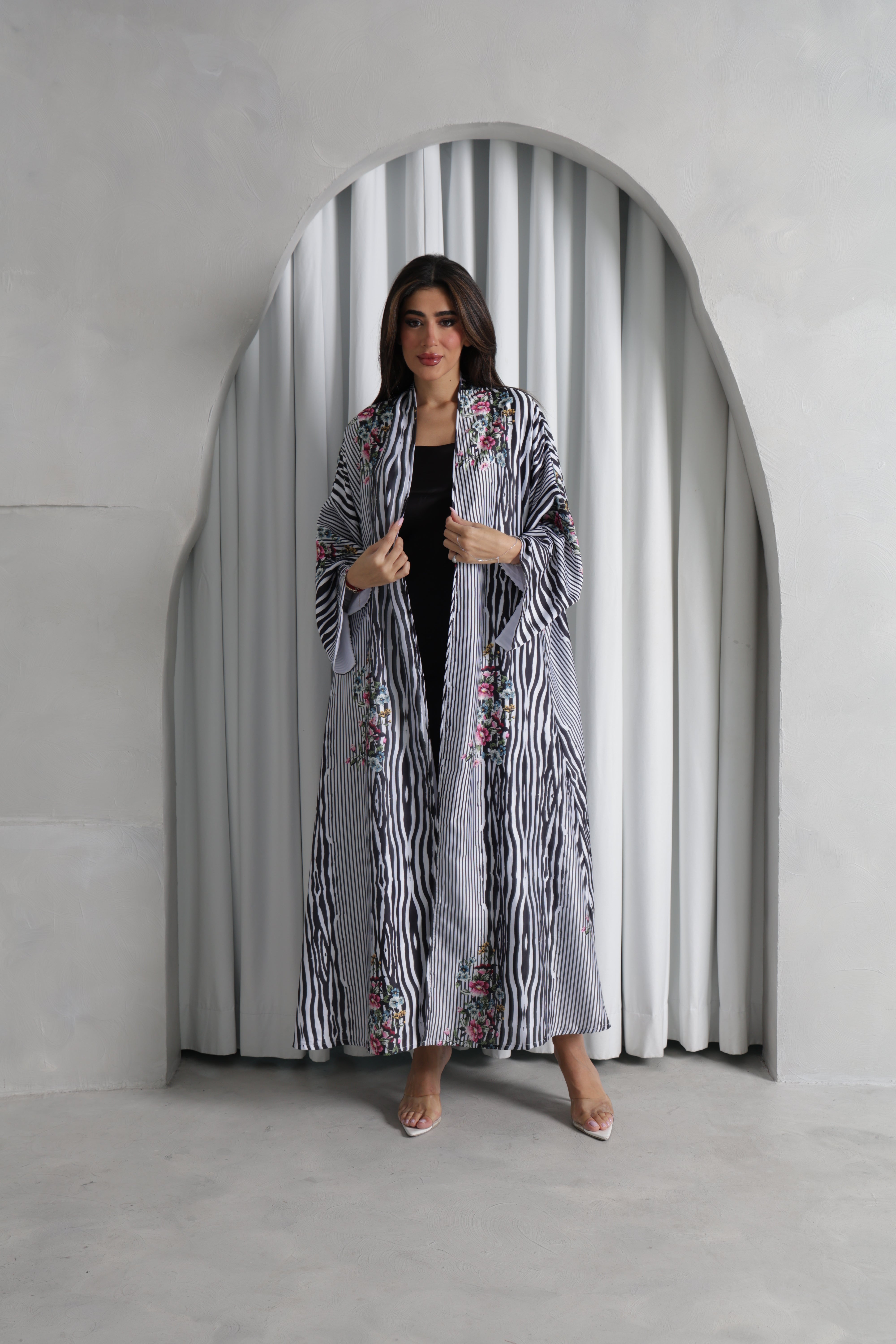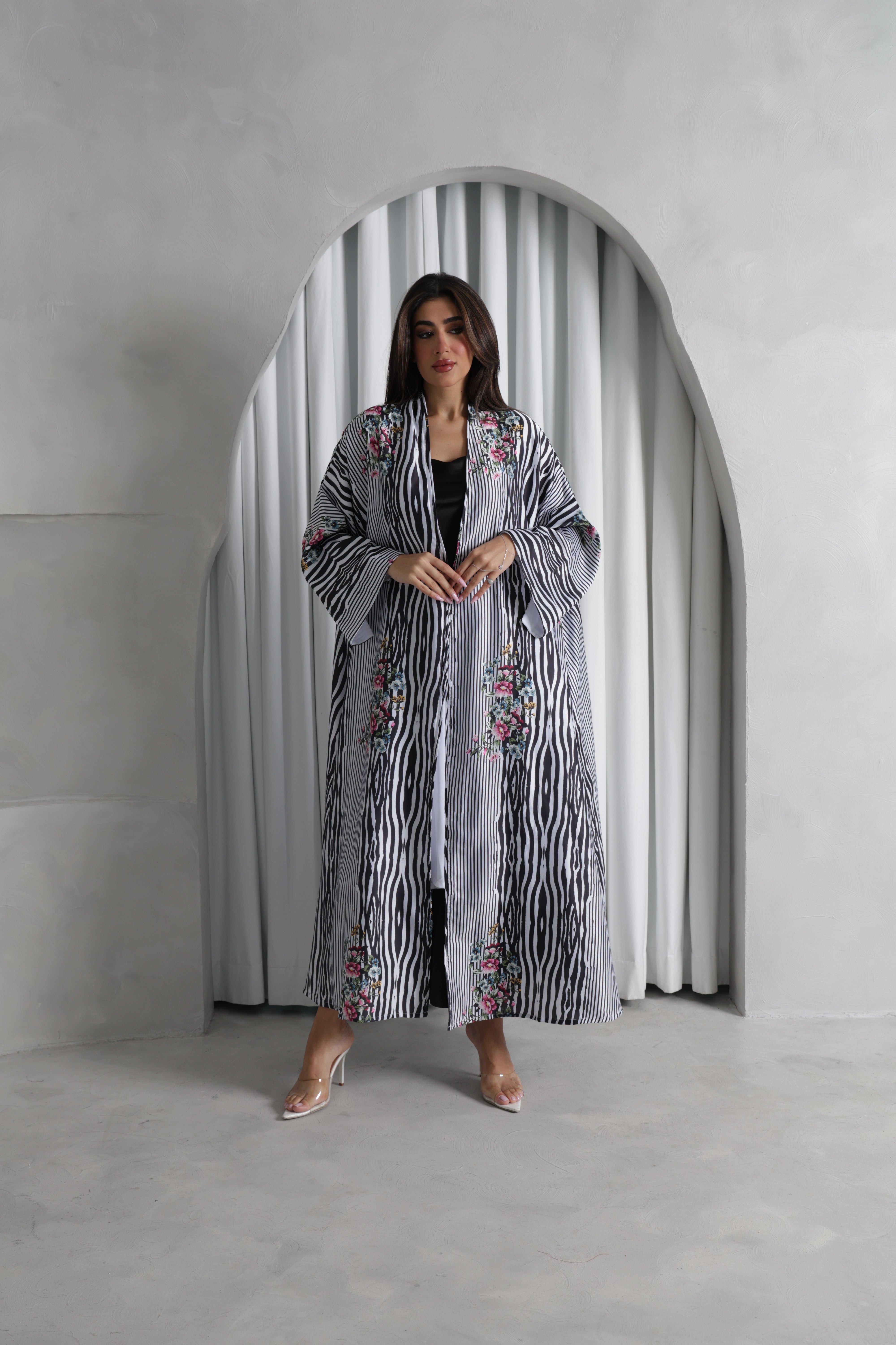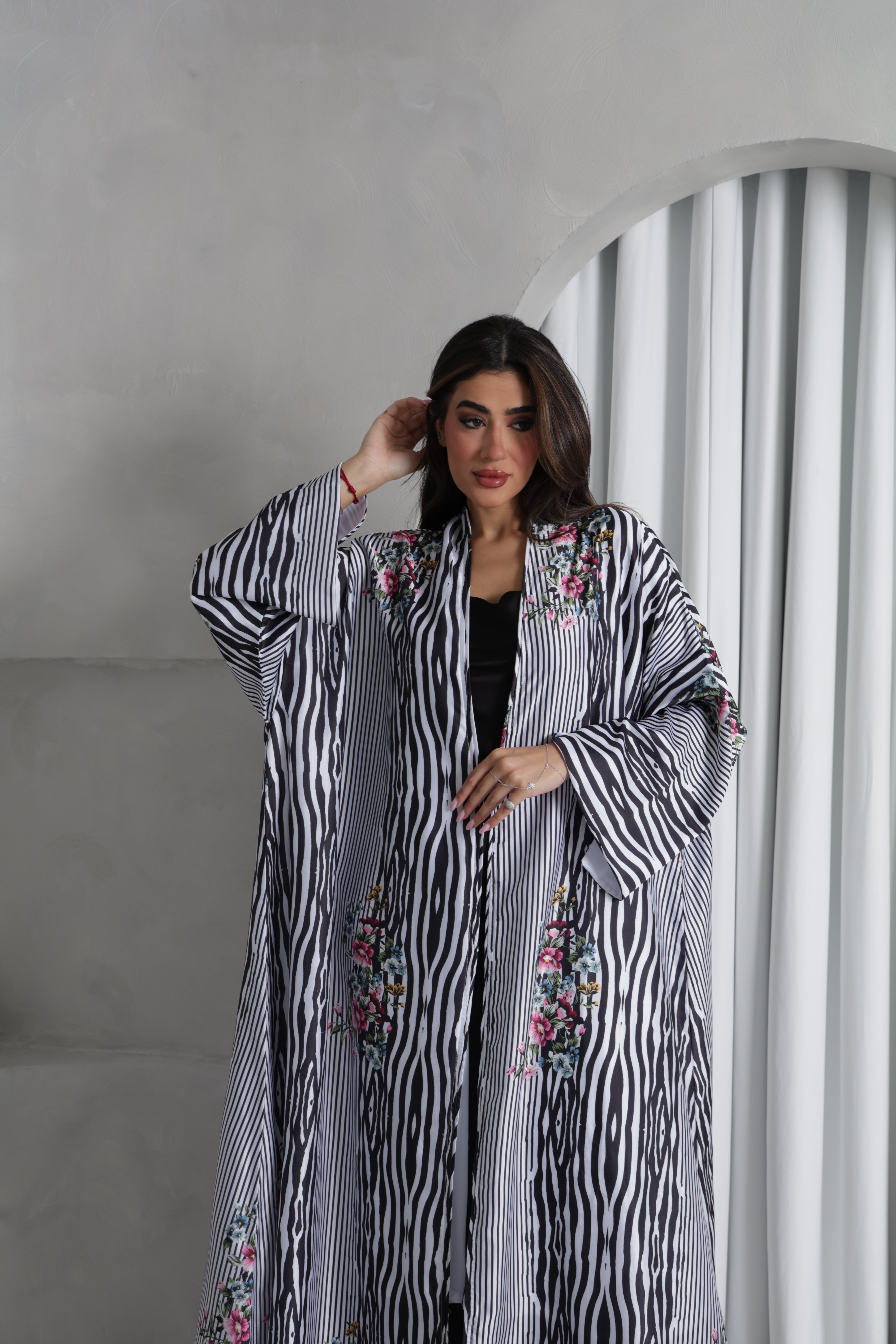 The Wild White Abaya radiates contemporary elegance with its bold black-and-white striped pattern, beautifully accented by vibrant floral embroidery. Crafted from premium lightweight fabric, it offers a relaxed fit and a flowing silhouette, embodying modern sophistication with a wild yet graceful touch.