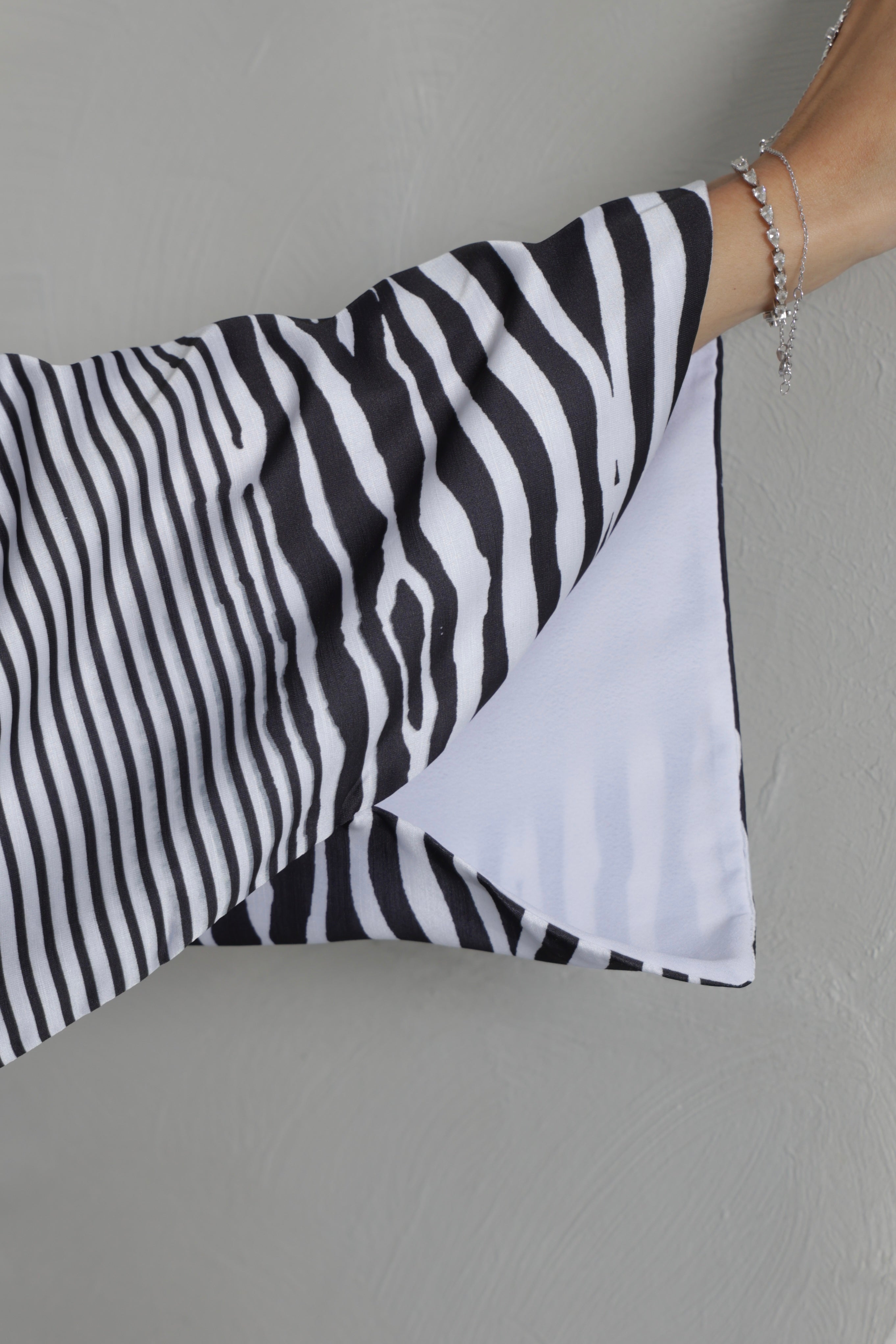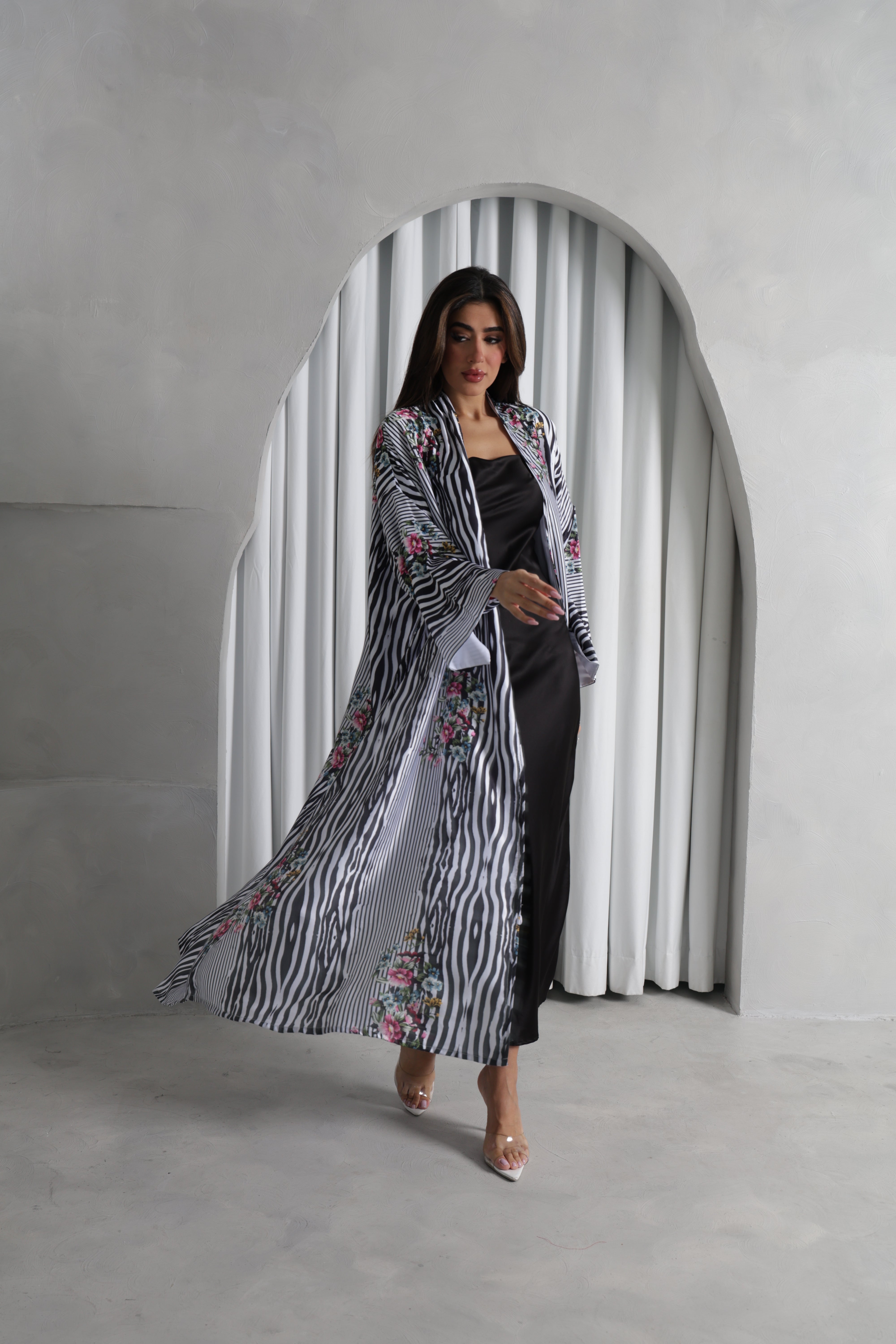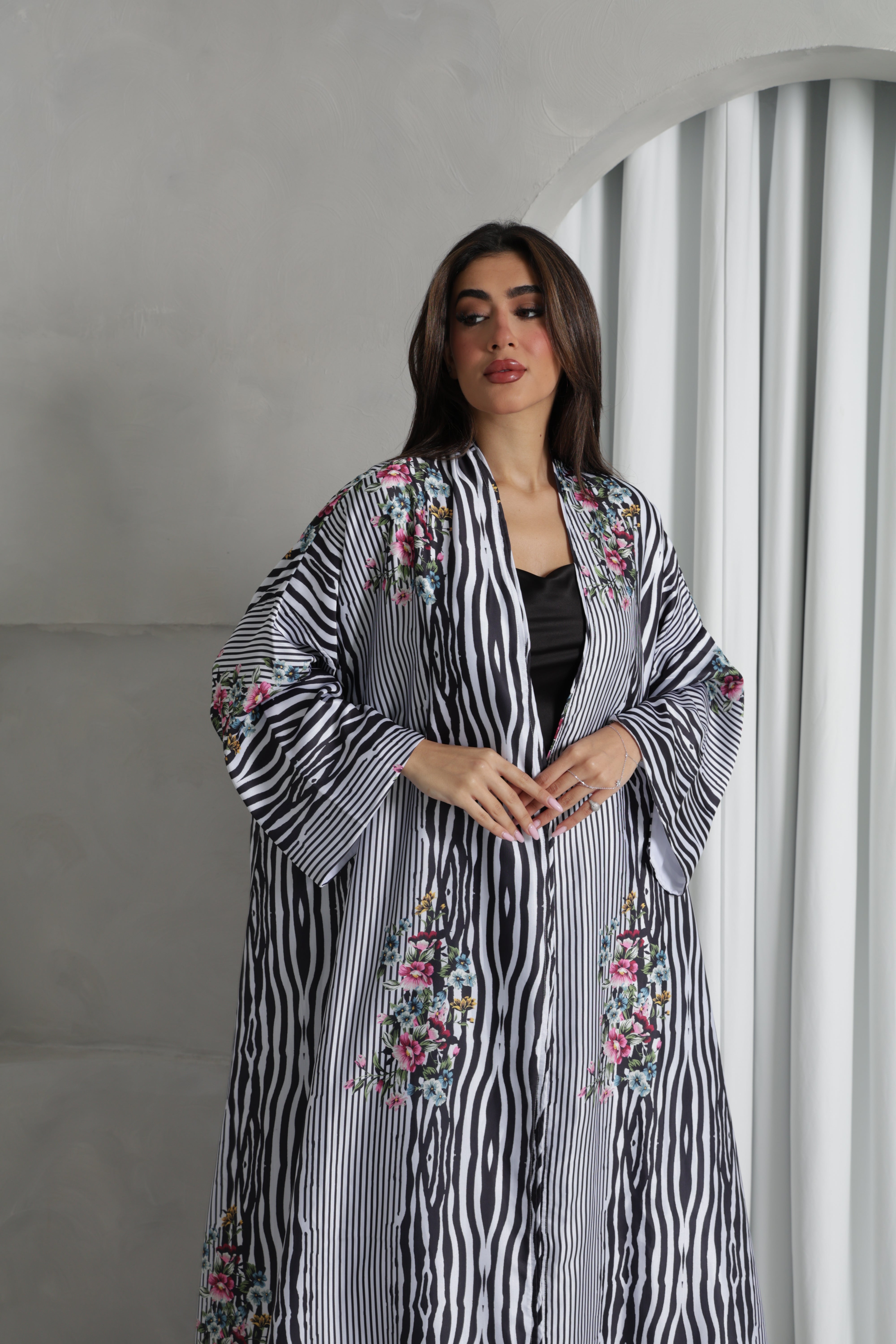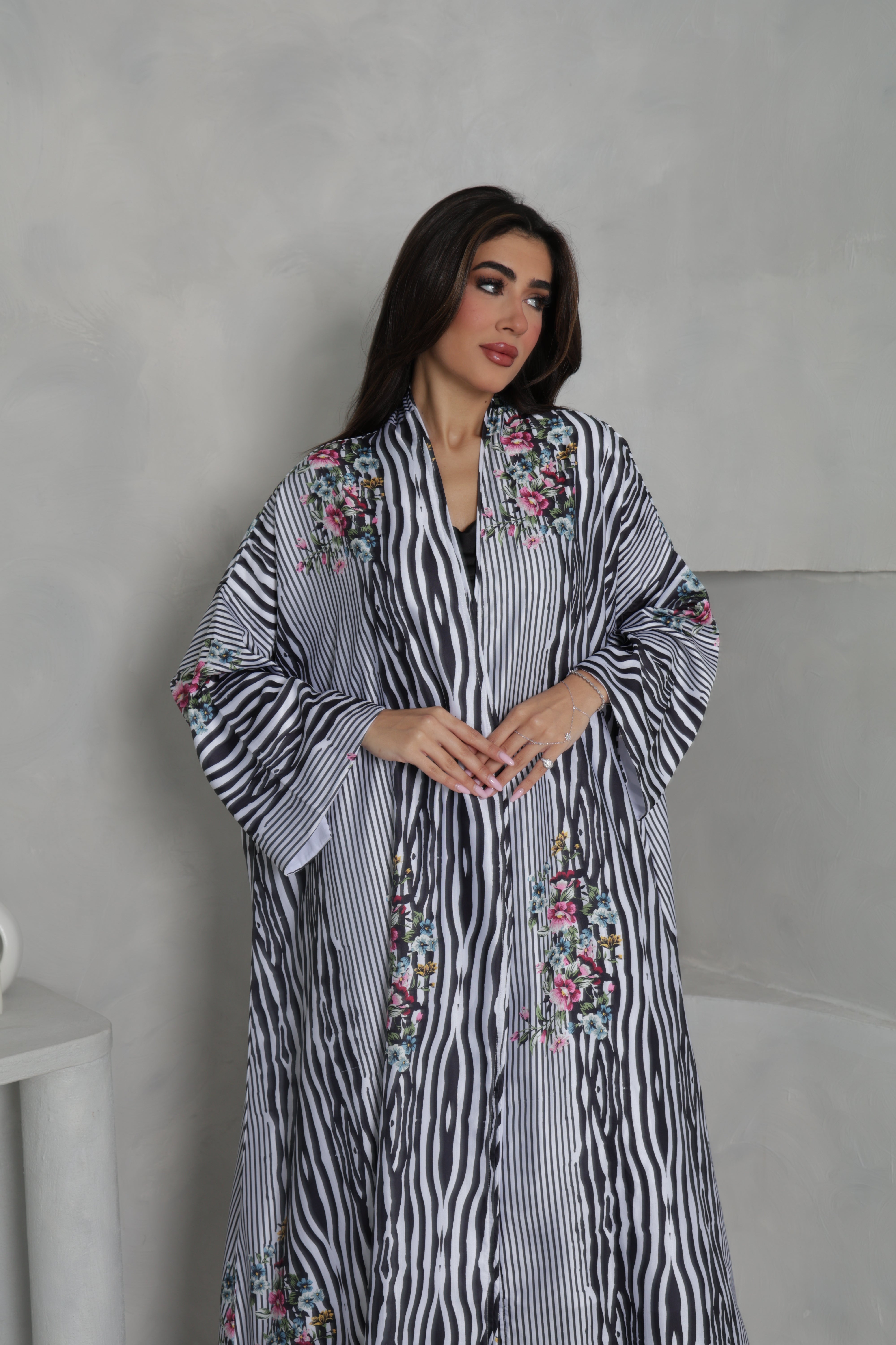 The Wild White Abaya radiates contemporary elegance with its bold black-and-white striped pattern, beautifully accented by vibrant floral embroidery. Crafted from premium lightweight fabric, it offers a relaxed fit and a flowing silhouette, embodying modern sophistication with a wild yet graceful touch.
