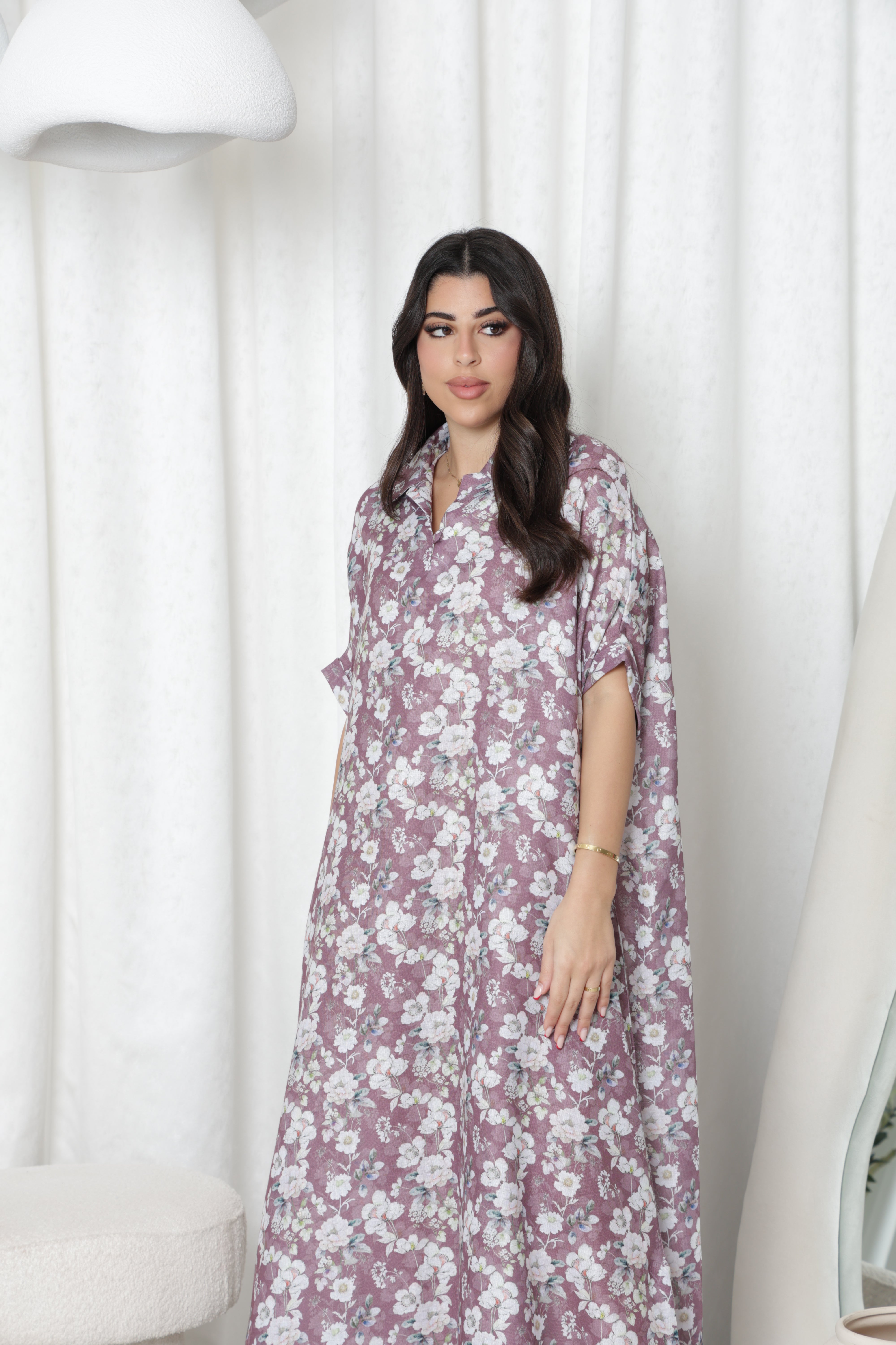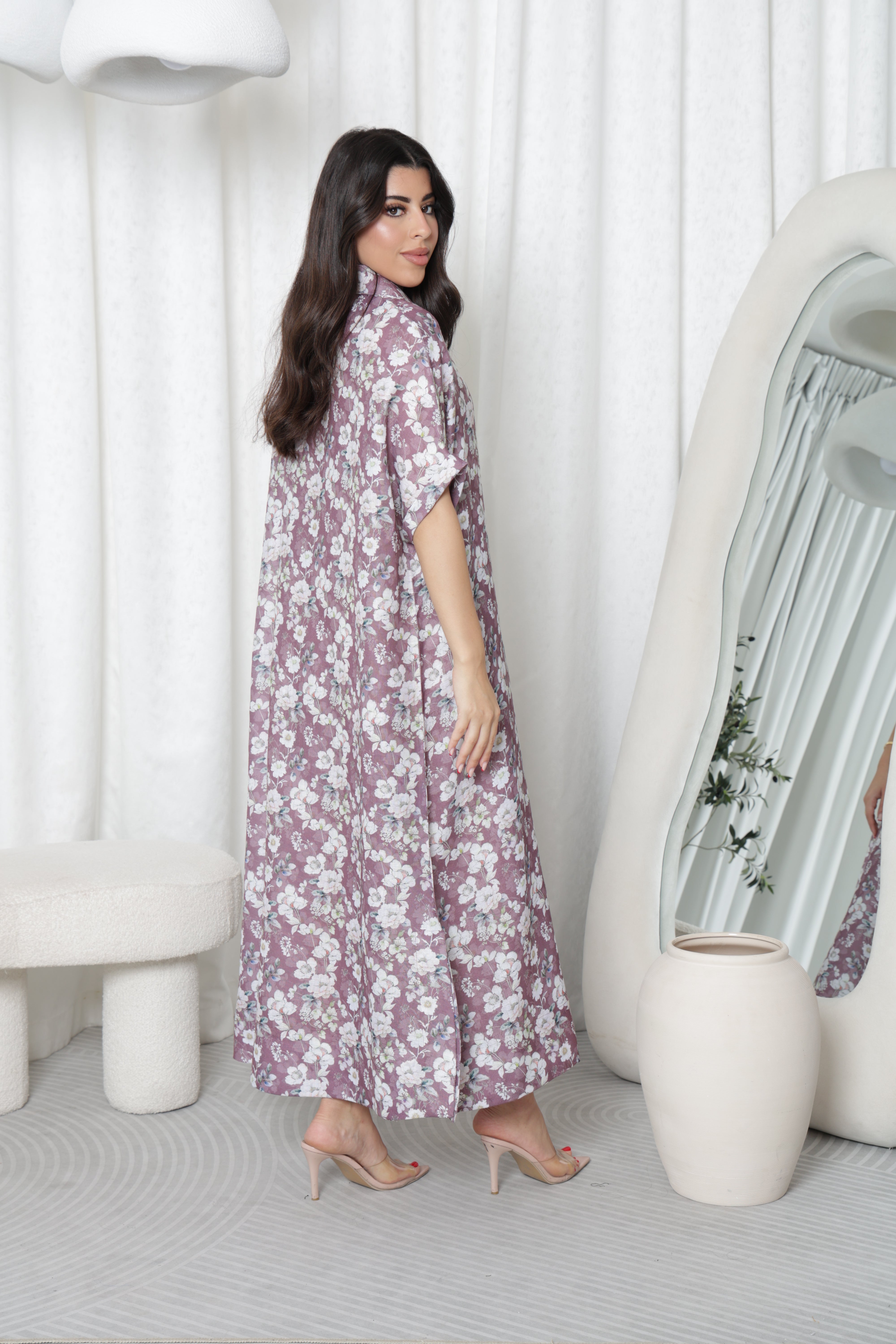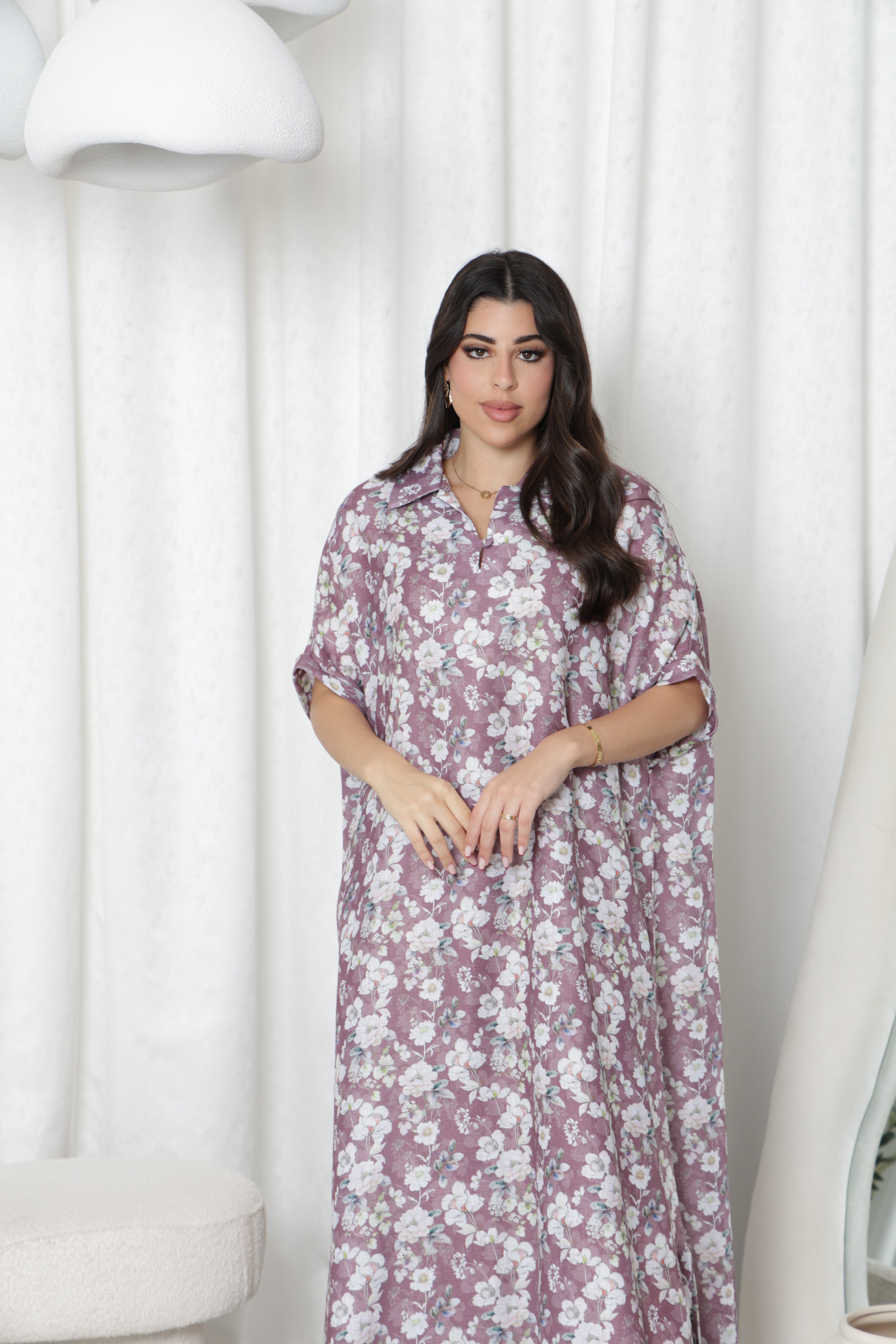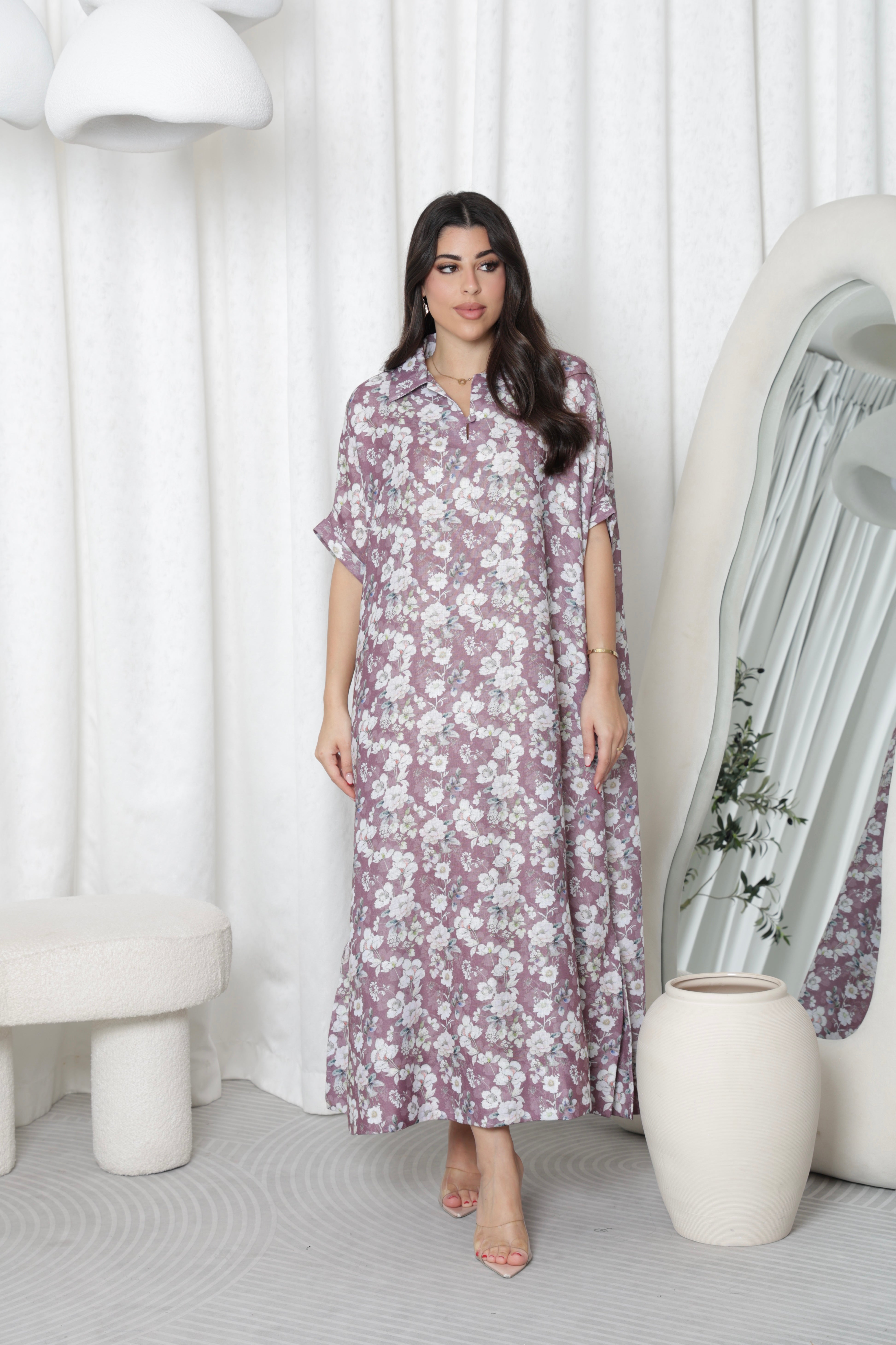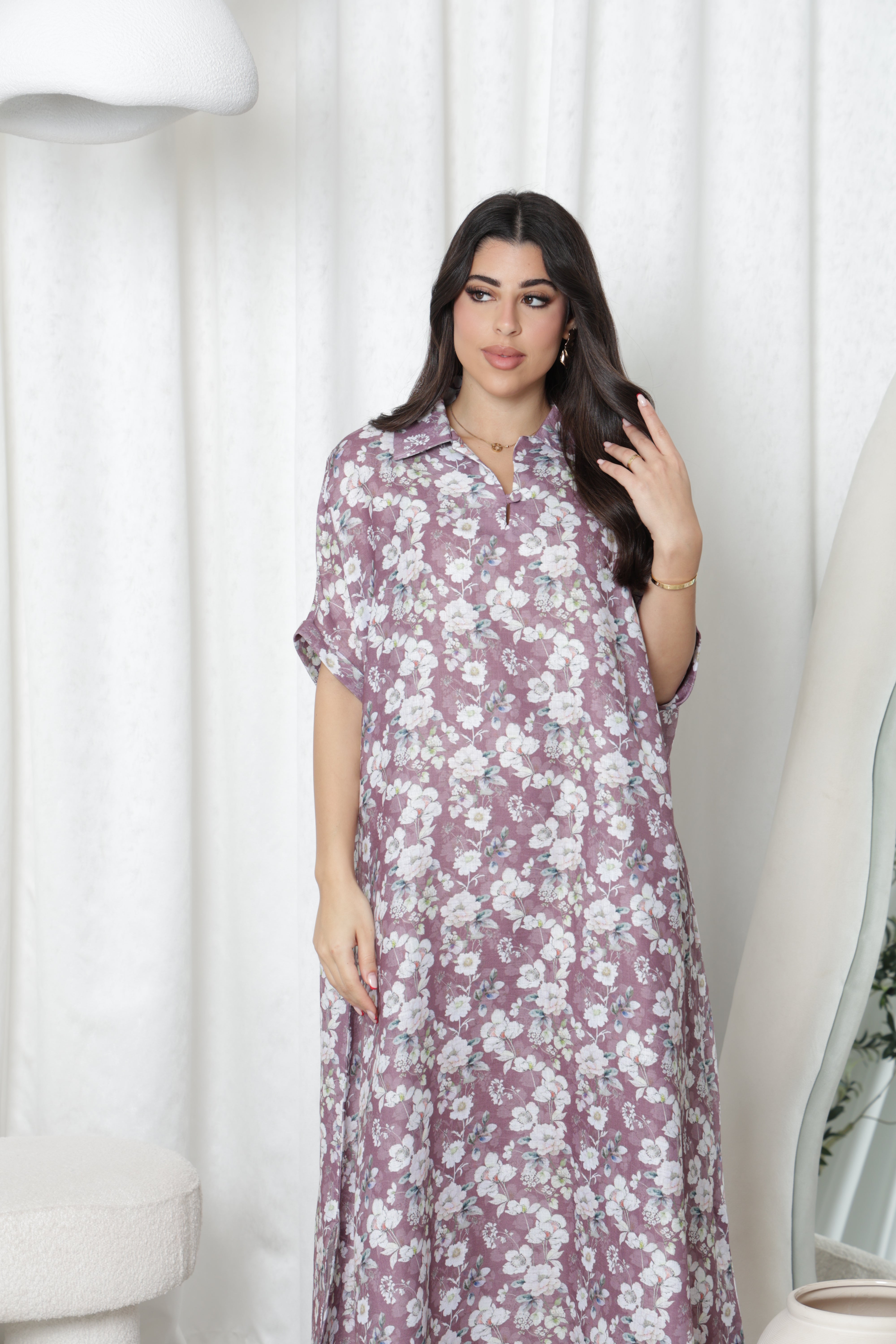 The Lavender Bloom Dress, crafted from natural linen, features a charming lavender hue adorned with delicate floral prints. Its breathable fabric and relaxed silhouette make it an elegant and comfortable choice for daytime events and casual gatherings.